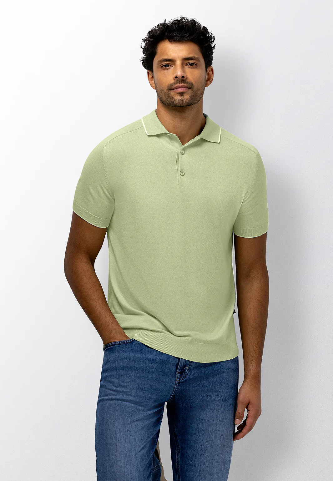 Fijngebreide polo met zadelmouwen, uitgevoerd in mouliné-garen voor een subtiel gemêleerd effect. De mix van katoen en modal voelt bijzonder zacht aan, valt soepel en biedt prettig draagcomfort gedurende de dag, waarbij modal bijdraagt aan een gladde structuur en een luxe uitstraling. Ontworpen in een regular fit en afgewerkt met een klassieke polokraag en knoopsluiting, voorzien van een subtiele contrasterende streep in de kraag en mouwboorden voor een verfijnd accent.
