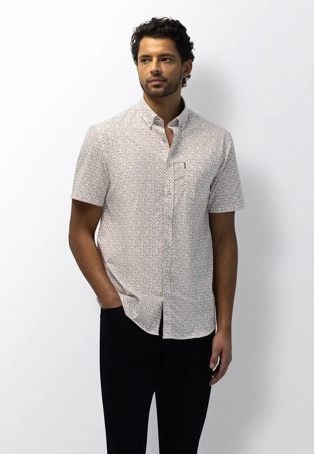 Poplin overhemd van een katoen-elastaanmix met een gladde, fijne structuur en lichte stretch. De regular fit draagt comfortabel en beweegt soepel mee. De all-over print geeft een verzorgde, eigentijdse uitstraling, terwijl de button-downkraag en borstzak zorgen voor een gebalanceerd ontwerp. Ideaal voor warme dagen dankzij de korte mouwen en het lichte, frisse draaggevoel.