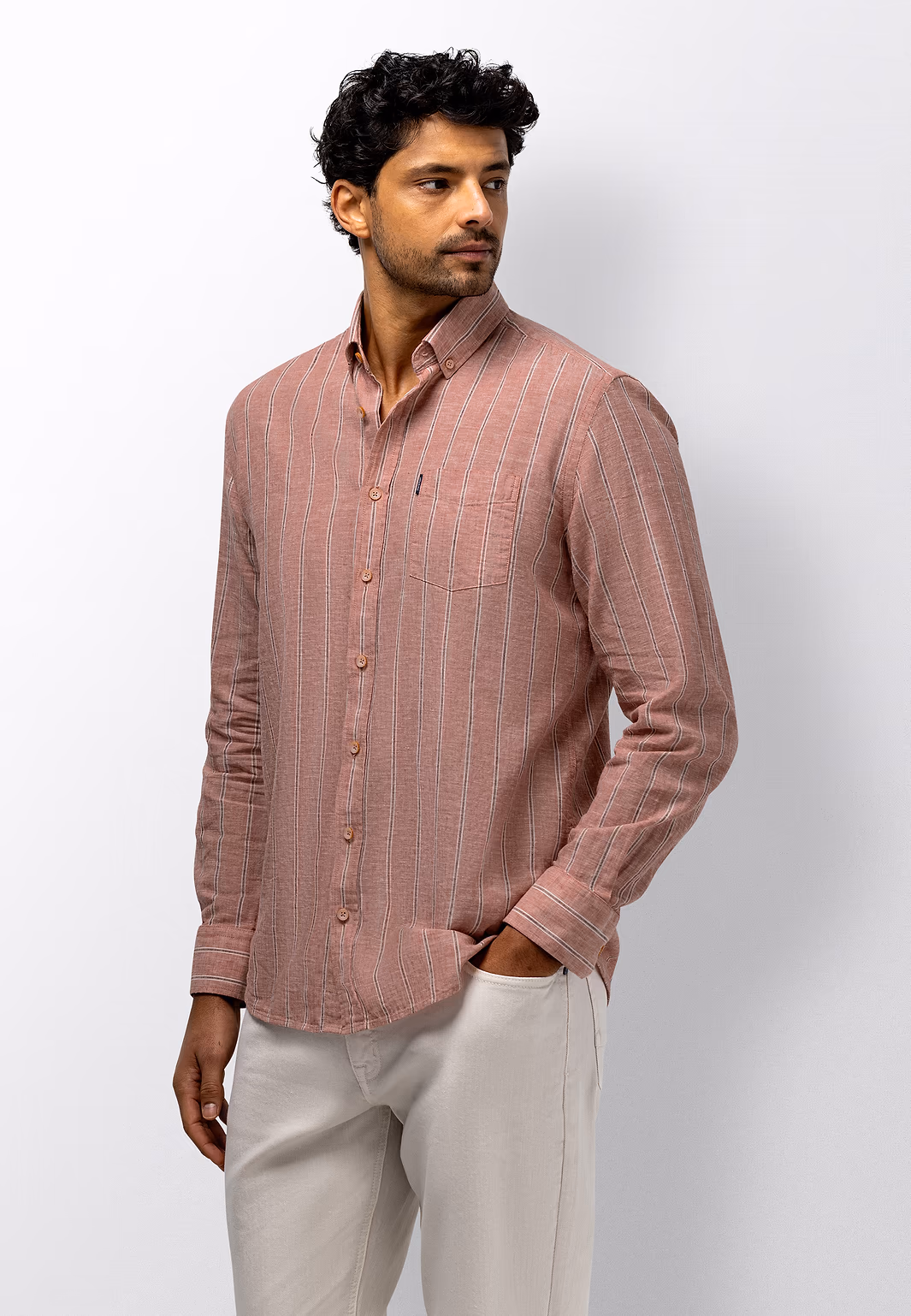 Regular fit overhemd met een gestreept dessin. Gemaakt van yarn-dyed stof, waarbij de garens vooraf worden geverfd. Dit zorgt voor een diepe, gelijkmatige kleur en een verfijnde uitstraling die mooi blijft. Voorzien van een button-downkraag en één borstzak. De mix van linnen en katoen voelt luchtig aan en biedt prettig draagcomfort voor dagelijks gebruik.