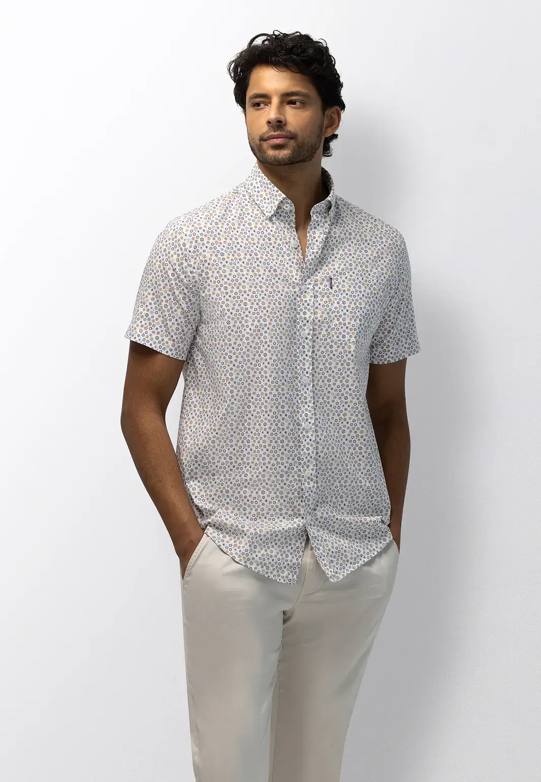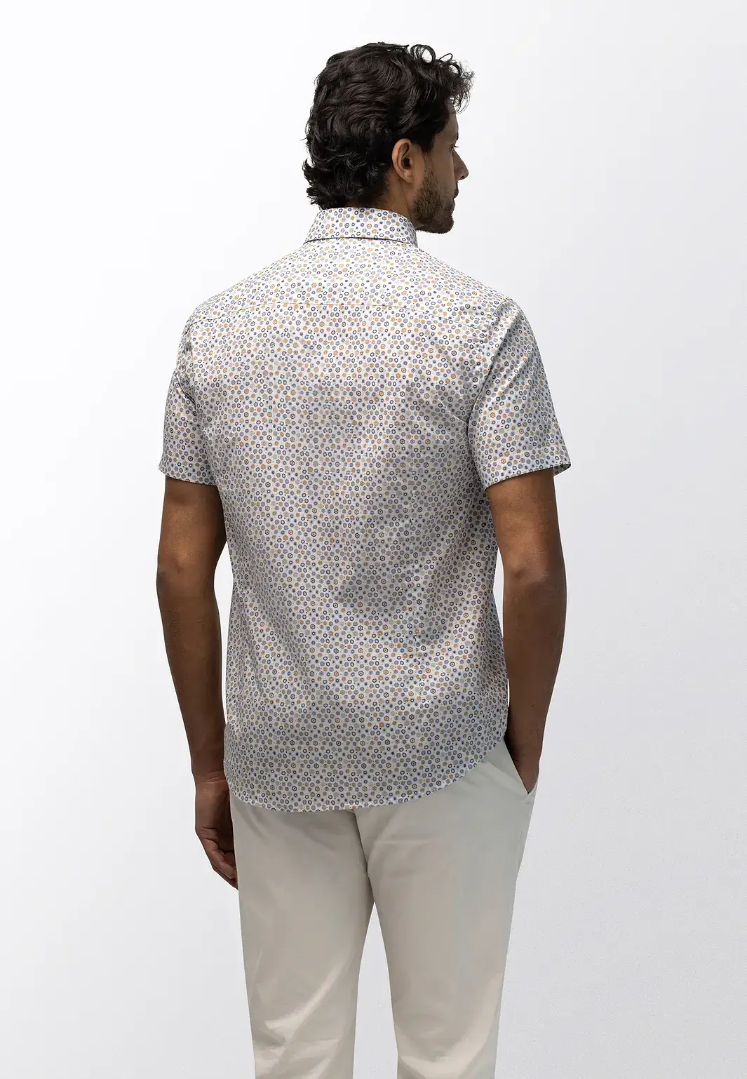 Dit State of Art overhemd is uitgevoerd in een lichte poplinstof met een fijne all-over print. De mix van katoen en elastaan zorgt voor een gladde, soepele structuur met lichte stretch en een frisse uitstraling. De regular fit draagt comfortabel en blijft mooi in vorm. Afgewerkt met een button-downkraag en borstzak voor een verzorgde, casual look, ideaal voor warme dagen.